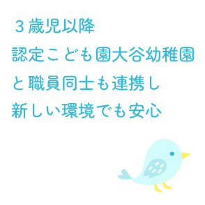 小規模保育園では卒園後、友だちと同じ保育園、幼稚園への就園が難しい場合がありますが、当保育園では全員が同じ認定こども園大谷幼稚園に進むことが可能です。
